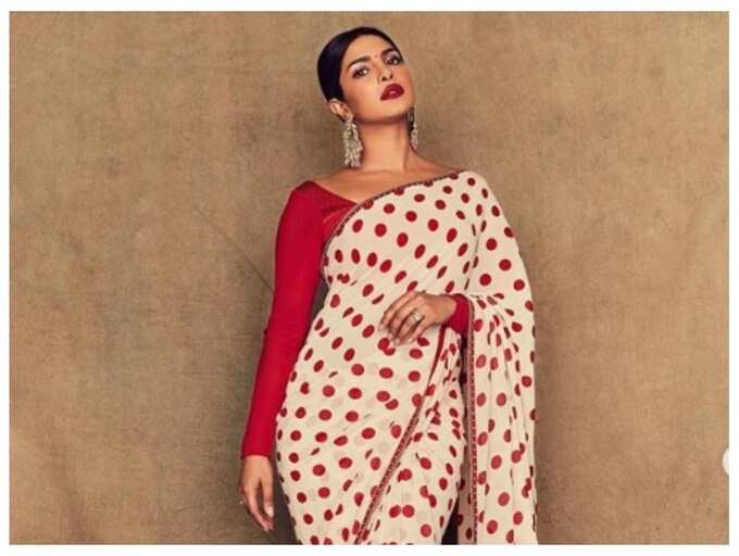 Priyanka Chopra left no stone unturned to impress her fans with her gorgeous looks while she was here in India, promoting her film, ‘The Sky Is Pink’. In one of the promotional events, she was seen dressed in a white and red polka dot saree and needless to say she looked simply ravishing.